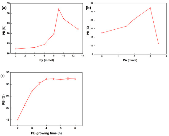 Effect of Py dosage (a), PA dosage (b), and PB growing time (c) on PB deposition.
