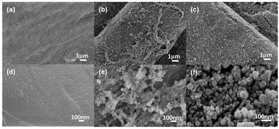 SEM images of CFs (a,d), PPy@CFs (b,e), and PB/PPy@CFs (c,f) at 20 kx and 150 kx magnifications.