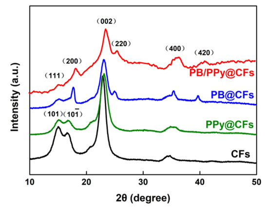 XRD curves of CFs, PPy@CFs, PB@CFs, and PB/PPy@CFs.