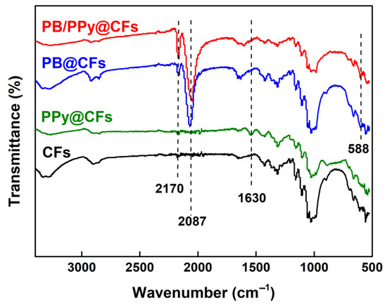 Figure 5 shows FTIR spectra of CFs, PPy@CFs, PB@CFs, and PB/PPy@CFs. The spectrum of CFs had obvious characteristic peaks of cellulose. The wide peak at about 3300 cm−1 belonged to O–H stretching vibration, and the peak at about 2880 cm−1 belonged to C–H stretching vibration. The absorption peak at about 1630 cm−1 in the spectrum of PPy@CFs was assigned to the N–H stretching vibration of PPy. The strong absorption bands at 2087 cm−1 and 2170 cm−1 in the spectrum of PB@CFs belonged to C≡N functional groups. The absorption band (650–450 cm−1) in the far infrared region was attributed to the Fe–C≡N–Fe bending mode characteristics of FeFe(CN)6, in which the peak at 588 cm−1 was the result of Fe-C vibration [30]. There were all the characteristic peaks of CFs, PPy@CFs and PB@CFs in the spectrum of PB/PPy@CFs, which proved the successful preparation of PB/PPy@CFs composite.
