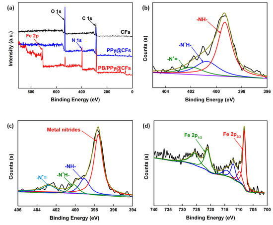 (a) XPS wide scan spectra of CFs, PPy@CFs, and PB/PPy@CFs; (b) N 1s XPS spectrum of PPy@CFs; N 1s (c) and Fe 2p (d) XPS spectra of PB/PPy@CFs.