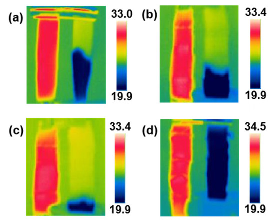 Infrared thermal imaging photos: (a) Pure water evaporation system in dark; Pure water evaporation system (b), CFs-foam water evaporation system (c) and PB/PPy@CFs-foam water evaporation system (d) after continuous irradiation for 15 min at 1 kW·m−2.