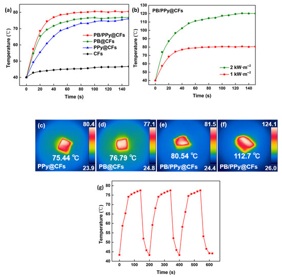 The xenon lamp was used to simulate solar radiation to study the photothermal performance of PPy@CFs, PB@CFs, and PB/PPy@CFs composites in the dry state. As shown in Figure 10a, under the illumination of a standard sun (1 kW·m−2), PPy@CFs, PB@CFs, and PB/PPy@CFs composites were rapidly heated, but CFs only reached 45.6 °C under 150 s illumination. After 150 s illumination at 1 kW·m−2, the surface temperatures of PPy@CFs, PB@CFs, and PB/PPy@CFs increased to 80.4 °C, 77.1 °C, and 81.5 °C, respectively (Figure 10c–e). After two standard sun illumination for 150 s, the surface temperature of PB/PPy@CFs could reach 124.1 °C (Figure 10b,f). The above results indicated that the PB/Ppy@CFs composite had the best photothermal performance. This was because PB nanoparticles were evenly distributed and had strong light absorption capacity. At the same time, Ppy is also a polymer with excellent photothermal performance, which can absorb near-infrared light and convert it into heat energy [33]. As shown in Figure 10g, through repeated heating/cooling cycles (turning on the xenon lamp for 150 s and then turning off for 100 s), three cycles confirmed the stable and fast photothermal conversion ability of PB/Ppy@CFs.