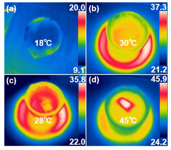 Different from the traditional method of heating the whole water area, the most prominent advantage of solar-driven interface water evaporation is heating interface water. Thus, a local high temperature region is formed at the vapor–liquid interface to realize efficient water evaporation. The surface temperatures of different water evaporation systems were recorded by infrared imager to evaluate the photothermal performance, and the results are shown in Figure 11. The surface temperature of the pure water evaporation system is 20 °C in dark (Figure 11a). After continuous irradiation at 1 kW·m−2 optical concentration for 15 min, the surface temperature of pure water evaporation system increased to 37.3 °C (Figure 11b). In the pure water evaporation system, when heating the whole water area, a large number of water bodies absorbed heat, the temperature of water in container increased as a whole and the heat was transferred to the surrounding environment, resulting in serious heat loss, so the surface temperature of water was low. The surface temperature of the CFs-foam water evaporation system was 35.8 °C (Figure 11c), slightly lower than that of pure water evaporation system, which might be caused by the reflection of sunlight on the surface of the pure white CFs. The surface temperature of PB/PPy@CFs-foam water evaporation system was as high as 45.9 °C (Figure 11d), which was mainly due to the excellent light absorption performance of PB for sun light and the ability to convert the absorbed light energy into heat energy.