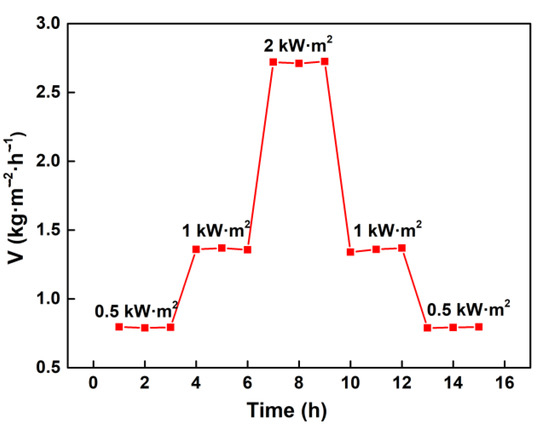 where, V is the evaporation rate, kg·m−2·h−1; M1 is the initial mass of the liquid, kg; M2 is the mass of the liquid under different illumination time, kg; A is the area of the tested sample, m2; ∆t is the time interval recording the liquid mass, h.