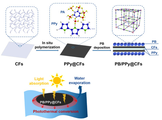 In this work, we used phytic acid (PA) doped PPy as a mediating layer to promote the growth of PB on CFs utilizing the electrostatic adsorption of amino groups in PPy on Fe3+ and the chelation of phosphate groups in PA, and the PB/PPy@CFs composite was obtained and used as a photothermal conversion material for solar-driven interfacial water evaporation (Scheme 1).