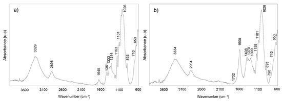 Poplar pulp and dried CNF samples have also been analyzed by FTIR (Figure 3). The spectra show the typical bands that conform to the cellulose structure. The wide band centered around 3329 cm−1 is related to the hydroxyl groups, whereas the small band at 2895 cm−1 is due to asymmetric and symmetric C-H stretching vibrations [56]. The band detected at 1645 cm−1 in poplar pulp is attributed to the O-H stretching vibration of absorbed water. The three bands at 1163, 1101, and 1026 cm−1 observed in both CNF and pulp samples spectra can also be assigned to cellulose. Firstly, the band at 1163 cm−1 is related to pyranosyl rings among C-O asymmetric bands, the band at 1101 cm−1 is attributed to the C-OH skeletal vibration, while the band at 1026 cm−1 is related to C-O stretching vibration [57]. Moreover, the glycosidic bond vibration was observed at 893 cm−1 in both spectra, and the bands at 1361–1370 and 710 cm−1 also observed in both spectra indicate the presence of Iβ cellulose allomorph [58], in agreement with X-ray diffraction analysis.