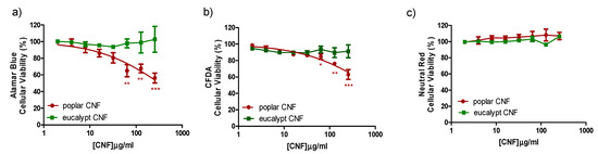 Although CNFs are isolated from cellulosic sources, biomasses with no or low toxicity, either the nanoscale or chemical modifications of nanofibers might influence their toxicity [60]. Then, the cytotoxicity assays of CNF samples obtained from P. alba L. “PO-10-10-20” and eucalypt (as reference CNF) were carried out. In general, the two CNF samples caused limited cytotoxicity to PLHC-1 cells so that an IC50 could not be calculated for any of the CNF samples with any of the cytotoxicity assays (Figure 4). In the case of the eucalypt CNF, no decrease of cell viability was detected with any of the tests so that even the calculation of an IC10 was not possible. Poplar CNF provoked a concentration-dependent decrease in cell viability allowing the calculation of IC10 values with AlamarBlue (IC10 = 10 µg mL−1) and CFDA-AM (IC10 = 60 µg mL−1) assays. No effect was observed at the lysosomal level by means of the Neutral Red assay. Such results suggest a very low toxicity of the tested CNF samples although additional in vivo experiments would be necessary to confirm the actual ecotoxicity of these substances. Of particular interest is the slight difference observed in the reduction of cell viability caused by both CNF samples (eucalypt and poplar). So far, considering the lack of significant differences observed in the properties of these cellulose nanofibers, it is difficult to hypothesize about the mechanisms underlying the slightly higher toxicity of poplar CNF. The investigation about the origin of this increase of cytotoxicity was out of the scope of the present study but it merits further efforts in the future.