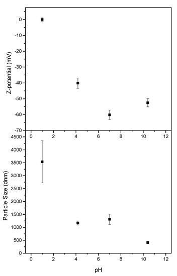 Both zeta potential and particle size analysis of the different pH-modified poplar CNF samples were included in Figure 5. By slightly increasing or decreasing the pH from the neutral sample, higher values of zeta potential were obtained compared to the very low values obtained at neutral pH (−60 mV). Therefore, slightly poorer stability was exhibited, but still stable enough since the values were lower than −40 mV, which is the limit for colloidal stabilization [64]. Nonetheless, when the pH was reduced to 1, poplar CNFs gelled and formed clots even at the low 0.05 wt % solution concentration, exhibiting values of zeta potential close to 0 (isoelectric point), results which were in agreement with previous studies within the field [65,66].