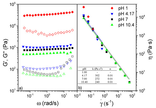 The subtle differences observed for viscoelastic functions between pHs 4.17, 7 and 10.4 were even lower when viscous flow measurements were considered (see Figure 6b). The shear-thinning behavior observed fitted properly the power-law model included in Equation (5):