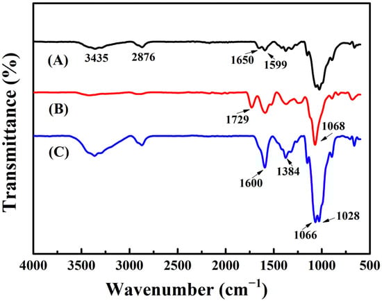 It is well known that functional groups are the reason why chitosan has many attractive properties. Therefore, the ATR-FTIR test was used to explore the changes of functional group during the synthesis of CS-TA and CS-TA-Na. Figure 1 shows the FTIR spectra of chitosan, CS-TA and CS-TA-Na. The spectrum of pure chitosan exhibited characteristic peaks at 1650 cm−1 and 1599 cm−1 originating from amide I (C=O stretching) and amide II (–NH2 stretching) of N-acetylglucosamine and N-glucosamine units, respectively (Figure 1A). Compared to chitosan, CS-TA spectrum presented a new peak at 1729 cm−1, which is attributed to the C=O stretching band [,]. It has been confirmed in previous studies that C6 alcohols and the –NH2 groups of chitosan react with the carboxylic groups of tartaric acid during the dehydration caused crystallization (Figure 1B) [,]. What is noteworthy is that the CS-TA-Na spectrum demonstrated a strong absorption peak at 1600 cm−1 derived from the symmetric and asymmetric –COONa and –NH2 bonds, indicating that CS-TA was hydrolyzed in NaOH aqueous solution to form salt bonds with –COONa groups (Figure 1C) [,]. In short, the ATR-FTIR results revealed that CS-TA-Na was featured in both carboxyl and amino functional groups.
