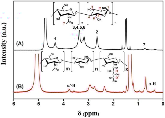 1H-NMR (nuclear magnetic resonance) spectra of (A) chitosan and (B) CS-TA-Na in CD2COOD/D2O = 2:98 (w1:w2) solvent.