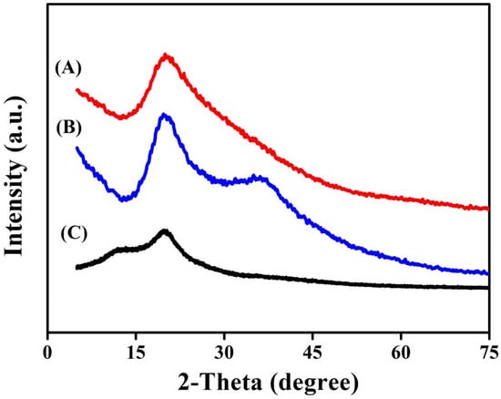 X-ray diffraction (XRD) patterns of (A) CS-TA, (B) CS-TA-Na, (C) chitosan.