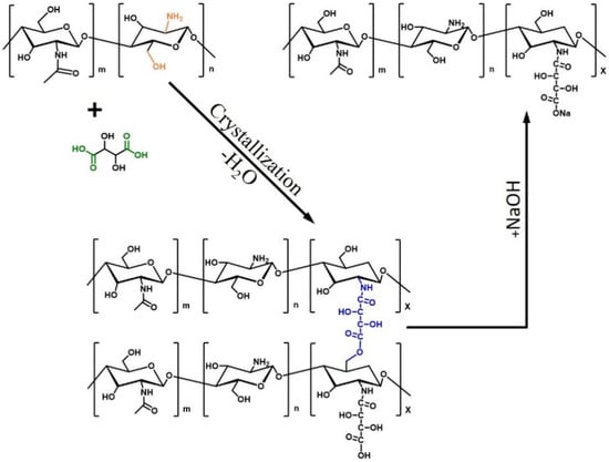 The synthetic method was prepared according to previous work [,] with some modifications. 0.5 wt% chitosan tartaric acid aqueous solution was obtained by dissolving the chitosan and 7.5 wt% tartaric acid in water, then the solution was poured into an open container and placed in the 90 °C air drying for 12–24 h to realize dehydration caused crystallization. After that, the sample was washed with ethanol by 6.5 wt% concentration of the dispersion to obtain the powder, named chitosan tartaric ester (CS-TA). We mixed 2 wt% NaOH aqueous solution and the ethanol dispersion of CS-TA at same volumes accompanied with stirring, then the solution was centrifuged and the centrifugal precipitate was washed with ethanol, then dried to obtain the CS-TA-Na powder.