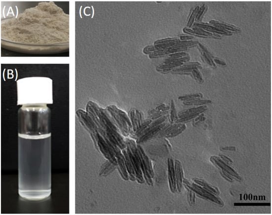 Figure 5 presents the photos of CS-TA-Na powder, CS-TA-Na water dispersion, and the TEM image of CS-TA-Na nanocrystals. It is worth noting that CS-TA-Na demonstrated a high yield and favorable water dispersibility. Meanwhile, the TEM image shows that the CS-TA-Na were about 20–50 nm in length and 10–15 nm in width. Interestingly, due to the hydrogen bonding interactions within and in between CS-TA-Na molecules, CS-TA-Na was prone to form a multilayer structure of polycrystals, leading to the parallel arrangement of CS-TA-Na nanocrystals and nanorods []. Such parallel structures are beneficial to self-assembly, resulting in ordered CS-TA-Na structures.