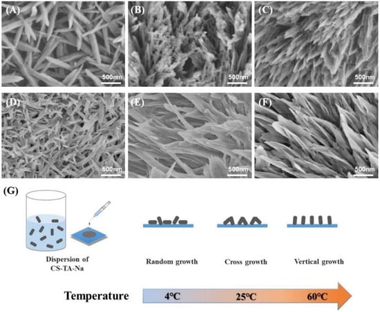 Figure 6 demonstrates the morphologies of self-assembled CS-TA-Na on glass and PTFE substrate at 4 °C, 25 °C and 60 °C, respectively. As shown in Figure 6G, the morphologies presented a dependence on the water evaporation rate and the surface characteristics of the substrate. When the water evaporation was slow (at 4 °C), CS-TA-Na had ample time to adjust and self-assemble, resulting in a more ordered structure. The assembled nanorods were more than 1 μm in length and 50 nm in width (Figure 6A,D) []. When the air-drying temperature increased, those dispersed CS-TA-Na nanocrystals tended to assemble quickly and interlace. At 25 °C, interlaced nanorods and nanosheets were observed (Figure 6B,E). Further increasing the drying temperature to 60 °C could lead to the flower-like pattern composed of vertical nanocrystals and nanosheets, as shown in Figure 6C,F. Obviously, there existed the vertical CS-TA-Na assembly on both the glass and PTFE substrate at 60 °C, suggesting that the morphologies of the patterns were mostly affected by the strong vertical convection originating from the higher rate of solvent evaporation. Therefore, the three-dimensional orders of the CS-TA-Na patterns could be controlled by tuning the rate of water evaporation and the surficial conditions of the substrate [,].