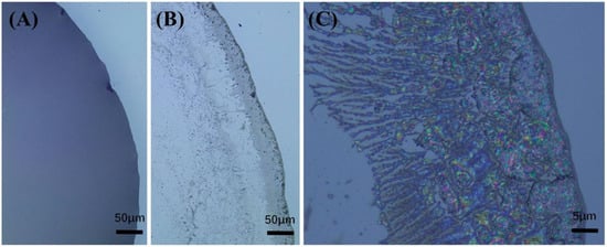 The self-assembly process of CS-TA-Na follows the nucleation and growth mechanism, as shown in Figure 7. First, CS-TA-Na nanocrystals dispersion was dripped onto the substrate to form a uniform liquid layer (Figure 7A). Then, nanocrystals moved towards the edge to form the seeds for nucleus growth on the substrate edge during the solvent evaporation. Finally, nanocrystals continued to grow around the initial nuclei to form the nanocrystals’ domain and dendrimer. The bright birefringence pattern of the nanocrystals with the main dendritic morphology was observed after the dispersion droplets were cast and evaporated at 60 °C for 60 s (Figure 7B,C). Meanwhile, an obvious coffee ring was more proof that the self-assembly of CS-TA-Na nanocrystals was influenced by fluid mechanical effects [].