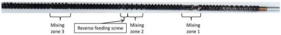 Figure 2. Screw profile of the used screws in the continuous parallel twin-screw extruder showing the three mixing zones.