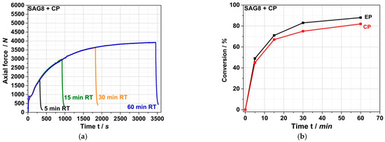 Figure 3a shows the force vs. time curves measured during compounding at 260 °C for up to 60 min by the force progression of the MC15 micro-compounder in a reactive melt mixture of SAG8 with CP with a stoichiometric ratio of EP and pOH groups.