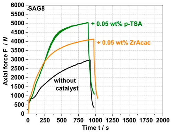 Figure 5. Force vs. time curves measured during compounding of a melt mixture of SAG8 and CP with a stoichiometric ratio of the EP groups in the SAG8 and the CP both in absence of a catalyst as well as in presence of 0.05 wt% of ZrAcac and p-TSA used as catalysts.