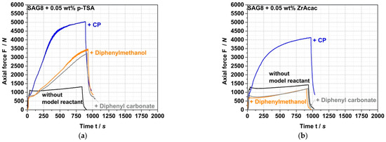 ZrAcac shows less catalytic activity compared to p-TSA (Figure 5), however, turns out catalytically much more selective in terms of the targeted EP-conversion with pOH-groups (Table 3 and Figure 6). Figure 6 shows the force vs. time curves measured during compounding of melt mixtures of SAG8 and model reactants of different reactive functionality in the presence of 0.05 wt% of p-TSA (a) and 0.05 wt% ZrAcac (b), respectively.