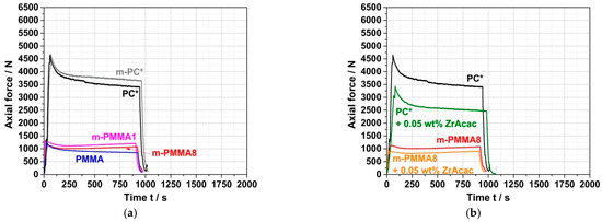 For reference purposes for the subsequent experiments on the preparation of reactively compounded blends, the force vs. time curves during compounding of the neat blend partners were first recorded in the absence of any catalyst (Figure 7a). As expected, the measured forces and their time dependences are quite similar for the non-reactive commercial PC* and the reactive m-PC* with pOH termination due to their similar molecular weights (Table 1). In both cases, the force decreases slowly with time, which can be attributed to some decrease in molecular weight due to hydrolysis of the PC. According to general expert experience, some molecular weight loss cannot be completely prevented under such melt compounding conditions since trace amounts of water can never be completely eliminated, even in pre-dried PC. When ZrAcac is added to PC, the shape of the force vs. time curve remains essentially unchanged, but the absolute force decreases significantly over the entire timeframe (Figure 7b). We interpret this result to mean that the catalyst softens the PC but does not lead to significantly faster PC degradation than is observed in the absence of the catalyst. The slight decrease in molecular weight during compounding was confirmed by GPC measurements. While the Mw of PC* before compounding was 46,000 g/mol (measured using PS calibration; see Table 1), values of 40,000 g/mol and 36,000 g/mol were measured after 15 min of melt compounding at 260 °C in the absence and presence of 0.05 wt% ZrAcac, respectively. Mw decreases of this magnitude are typical for commercially available PC under this type of thermal exposure. The effect of ZrAcac on molecular weight degradation can be considered small compared to alternative catalysts that we had previously screened.