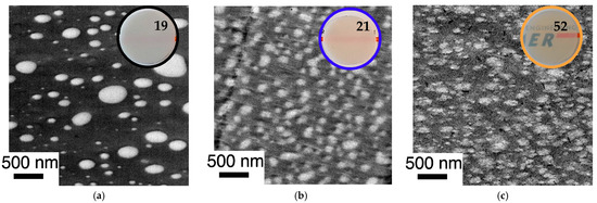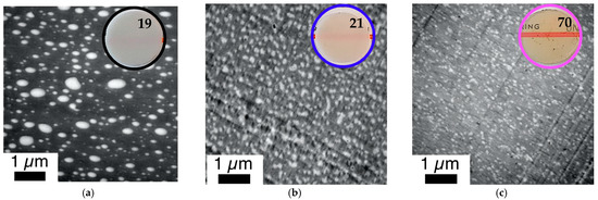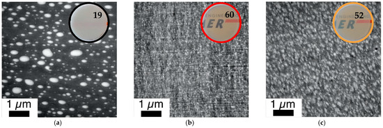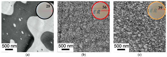 Figure 14. Correlation of phase morphology and transparency of 1 mm thick plaques (numbers represent transmission values determined according to DIN EN ISO 13468-1 on these specimens) prepared by compression molding of various PC/PMMA (50/50) blends. Figure 14 shows a comparison of blends obtained from non-reactive polymers and blends obtained both in absence and presence of ZrAcac, from pOH-terminated PC and GMA-modified PMMA with a GMA content of 8 wt%. The RT in the reactive extrusion production of samples shown in (b,c) were 12 min and 8 min, respectively. (a) PC*/PMMA (50/50) (b) m-PC*/m-PMMA8 (50/50) (c) m-PC*/m-PMMA8 (50/50) + 0.05 wt% ZrAcac.
