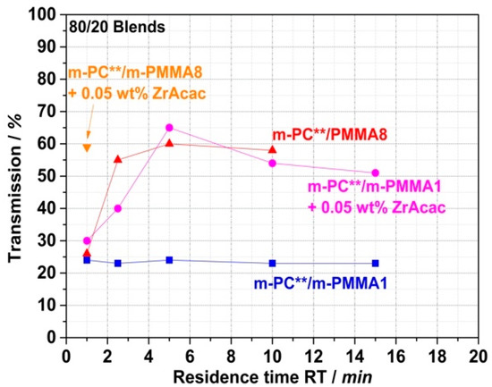 Figure 18 shows a comparison of the transmission values of reactively compounded PC/PMMA blends that were obtained at different RTs in a discontinuous extrusion process under low shear conditions, with those produced in the continuous twin-screw extruder. As expected, the presence of higher shear in the reactive compounding step allows a reduction in the RT that is required to achieve sufficient copolymer formation to result in blend materials revealing high light transmission. Thus, with the continuous high-shear reactive extrusion process, translucent materials were obtained at RTs as low as 1.5 min. On the other hand, in the case of the blend produced with m-PMMA8 in the presence of the ZrAcac catalyst, for which high transmission had been achieved at an RT of only 1 min already in the discontinuous extrusion, no significant further improvement in the light transmission could be achieved by applying the higher-shear continuous process.