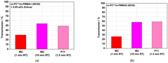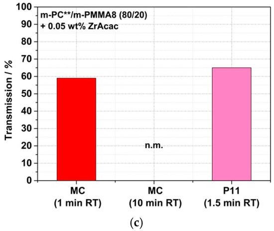 Figure 18. Comparison of light transmission values measured on 1 mm thick plaques made of reactively compounded PC/PMMA (80/20) blends obtained in a discontinuous micro-compounder (MC) at two different RTs and in a continuous twin-screw extruder (P11). Materials were made of pOH-terminated m-PC** and GMA-modified m-PMMA1 in the presence of ZrAcac (a) and with m-PMMA8 in the absence (b) and presence (c) of this catalyst. Test specimens of the materials produced in the micro-compounder were prepared by compression molding of the compounded pellets, while the plaques produced from the materials obtained in the twin-screw extruder were injection-molded.