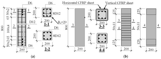 According to the research results of previous researchers for partially FRP-confined RC columns, the strength and ductility of partially FRP-confined RC specimens can be significantly increased [11,12,13]. Barros and Ferreira [11] studied the effectiveness of the discrete confinement through concrete cylinders confined by distinct arrangements of strips of CFRP sheet under concentric load up to the failure point. From the evaluation on the influence of the width of the strip, distance between strips, number of CFRP layers per strip, CFRP stiffness, and concrete strength class, it was found that load carrying capacity and ductility of concrete specimens increase up to 3.27 and 5.02 times, respectively. Abdel-Hay [12] investigated the overall behavior of ten RC square columns. The main parameters studied in this research were the compressive strength of the upper part, the height of the upper poor concrete part, and the height of CFRP wrapped part of column under eccentric load. It was found that partially CFRP strengthening of square column gave good results in term of loading capacity, up to 1.3 times in compare with controlled column. The study of Lewangamage et al. [13] used 17 RC specimens of 150 mm × 150 mm × 350 mm with fully and partially CFRP confinement under concentric load. Although the volumetric ratio of CFRP was kept same for all partially confined columns, it was observed that, depending on the jacket location, the strength and ductility increments would vary. The experimental results showed considerable improvements in strength (up to 83% and 100% for fully and partially confined specimens, respectively) and ductility (up to 10 and 12.7 times for fully and partially confined specimens, respectively) in comparison with controlled specimens. Turğay et al. [14] focused on the investigation of the total effect of longitudinal and transverse reinforcement of large-scale square RC columns and figured out that partial CFRP-wrapping resulted an increase in ductility of longitudinal bars. Pham et al. [15] founded that a partial wrapping arrangement changes the failure modes of specimens and the angle of failure surface.
