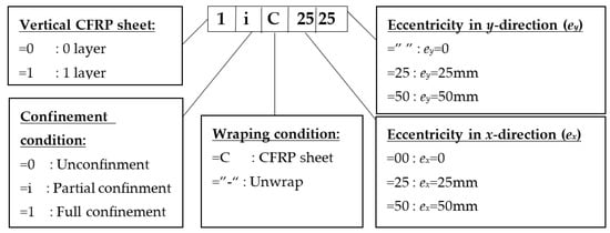 The experiment includes 5 controlled columns and 9 CFRP-strengthening ones. All columns were cured at a temperature between 26 and 30 °C and humidity between 60% and 80%, within the manufacturer’s recommendations. After 28 days of curing, all controlled columns were tested and used as the reference columns, and 1 layer of vertical CFRP sheet with the main fiber along the axial axis at four sides was applied to all CFRP-strengthening columns. Then, these 9 strengthened columns were divided into three groups according to confinement purpose, namely unconfined (3 columns), partially CFRP-confined (4 columns), and fully CFRP-confined (2 columns). After 7 days of adhesive curing, 3 unconfined columns were tested. Meanwhile, partially and fully CFRP-confined columns were partially and fully wrapped for concrete confinement investigation, respectively. The description of the columns’ names is represented in Figure 2.