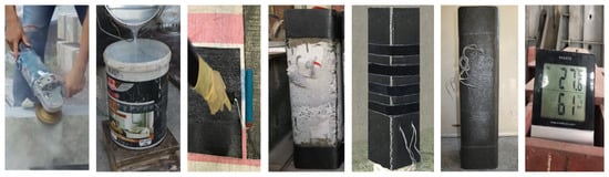 Four corners of the columns were rounded off with a radius (Rc) of 20 mm to eliminate the stress concentration and maximize the strengthening efficiency. The surface preparation was carefully performed according to the instructions of the supplier. CFRP sheets were wrapped around the perimeter of the columns with an overlapping-zone of 150 mm. Figure 4 represents the process of strengthening and curing.