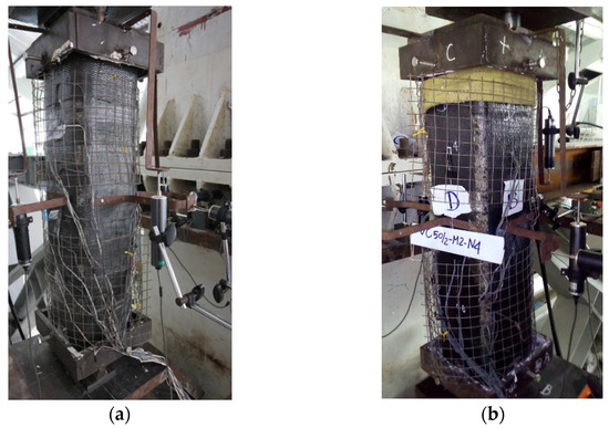 For fully FRP-wrapped RC columns under eccentric compression, the load-carrying capacity and ductility of the columns have been improved significantly through several studies [1,2,3,4]. Chaallal and Shahawy [1] investigated the performance of reinforced concrete members strengthened with externally applied bidirectional CFRP material. From the experiment with the eccentric distance as the main variable, they found that the strength capacity of members improved significantly as a result of the combined action of the longitudinal and the transverse weaves of the bidirectional composite fabric. The maximum capacity gain achieved was slightly below 30% in pure compression, and over 54% in pure flexure. Eshghi and Zanjanizadeh [2] studied the seismic repair of damaged square reinforced concrete columns with poor lap splices, 90-degree hooks, and widely spaced transverse bars in plastic hinge regions using glass fiber reinforced plastic (GFRP) sheets. Three specimens of 150 × 150 × 1000 mm were tested in “as built” condition and retested after being repaired by GFRP sheets in critically stressed areas near the column footings. The test includes numerous reversed lateral cyclic loads with a constant axial load ratio. The results indicated that, by increasing the existing confinement in the column critical regions, ductility of repaired columns was improved from 12% to 113%. Rahai and Akbarpour [3] presented the results of an experimental study on rectangular RC columns strengthened with CFRP sheets under axial load and biaxial bending moment. Eight large-scale RC columns of 150 mm × 450 mm × 2400 mm were tested under bi-eccentric compressive loading up to failure. Investigation parameters include CFRP thickness of one, two, three, and four layers, fiber orientations of ±45, 0, 90, and their combination, and eccentricities in the direction of both weak axis and main axis. From the experiment, they found that a great improvement in moment strengthening up to 250%, and in compression strength up to 64% thanks to CFRP confinement. Hadi and Widiarsa [4], also studied the influence of the number of CFRP layers (one, two, and three layers), the magnitude of eccentricity (0, 20, and 25 mm) and the presence of vertical CFRP straps by testing sixteen specimens under eccentric loading. Results of this study showed that CFRP wrapping enhanced the load-carrying capacity (up to 18%) and ductility (up to 300%) of the columns under eccentric loading. Furthermore, the application of the vertical CFRP straps significantly improved the performance of the columns with large eccentricity.