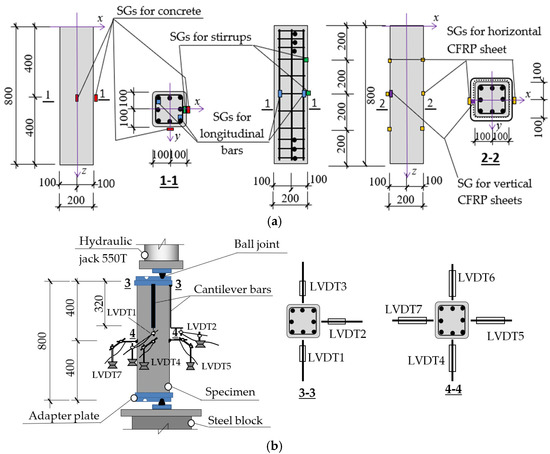 All the columns were tested with an eccentric loading mechanism (except for column 00-00 under concentric loading), as shown in Figure 5. Figure 6 represents the installed specimen on the loading device. The axial and lateral displacements of the columns were monitored by seven linear variable differential transformers (LVDTs), of which three LVDTs were used for measuring the axial displacement while the remaining four LVDTs were utilized for lateral displacement at the midheight. The compressive strain of concrete was measured by two strain gauges (SGs) attached to the midheight of the columns, as shown in Figure 7. The strain of vertical CFRP sheets was measured by one SG at the extreme tension side, and those of horizontal CFRP sheets were monitored by using six SGs at three sections, including 2 SGs at each section as shown in Figure 7. The strain of longitudinal reinforcements was measured by 2 SGs at the midheight while the strain of stirrups was monitored by 2 SGs attached to midheight and one-fourth of the columns.