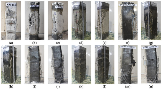 Failure modes of the tested columns; (a) 00-00; (b) 00-25; (c) 00-50; (d) 00-2525; (e) 00-5050; (f) 10C50; (g) 10C2525; (h) 10C5050; (i) 1iC25; (j) 1iC50; (k) 1iC2525; (l) 1iC5050; (m) 11C25; (n) 11C50.