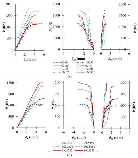 The reduction of the axial stiffness led to a significant increase in the axial displacement (δv) and lateral displacement (δhx for x direction and δhy for y direction). The higher the e/h ratio was, the larger the ultimate displacement of the columns. At the ultimate state, the axial displacement (δvu) of unconfined columns 00-25, 00-50, 00-2525, and 00-5050 increased by 23%, 32%, 62%, and 73% in comparison to column 00-00. The corresponding increase of the lateral displacement of unconfined columns 00-25, 00-50, 00-2525, and 00-5050 was up to 238% regarding column 00-00. For the partially CFRP-confined columns, the maximum increment of the axial displacement of 85% was recorded for column 1iC5050 regarding column 00-00. Meanwhile, column 1iC5050 achieved the maximum lateral displacement of 236% in comparison to the reference column 00-00 (Table 3). For the fully CFRP-confined columns, increments of the axial displacement of 82% and 89% were recorded for columns 11C25 and 11C50 regarding column 00-00. As can be seen in Figure 9, at a particular applied load, the displacement increment of the partially and fully CFRP-confined columns was smaller than that of the unconfined columns and the displacement increase also reduced with a higher level of concrete confinement. In addition, the ultimate axial and lateral displacements of the partially and fully CFRP-confined columns were much higher than those of the unconfined columns. For example, the ultimate axial displacements of columns 1iC50 and 11C50 increased by 17% and 43%, and ultimate lateral displacements by 8% and 25% of columns 1iC50 and 11C50 in comparison with column 00-50, respectively. This observation indicated that CFRP sheets were very effective in improving the maximum displacement of the strengthened columns even with partial confinement.