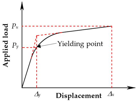 The axial load–displacement curves of the tested columns are represented in Figure 9. A summary of the test results is tabulated in Table 3. Py and Pu are yielding and ultimate load, respectively. In Table 3, Pu0 is the maximum load of the controlled column 00-00. During the early loading stage 0–0.70Pu, the load–displacement curves of the unstrengthened columns were linear, whereas afterward, the columns behaved in a non-linear manner, leading to a significant increase of the displacement. The yielding load, Py, is defined in Figure 10 as adopted in previous studies [20,21,22]. Py was slightly affected by the patterns of CFRP sheets, but it was considerably affected by eccentricity with the value of 64% Pu for concentric load (columns 00-00) and between 84% Pu and 94%Pu for eccentric load as shown in Table 3. For example, the yielding loads of columns 00-25, 00-50, 00-2525, and 00-5050 were respectively 84%, 94%, 94%, and 93% of Pu while the yielding loads of columns 1iC25, 1iC50, 1iC2525, and 1iC5050 were 91%, 88%, 93%, and 84% of Pu, respectively.