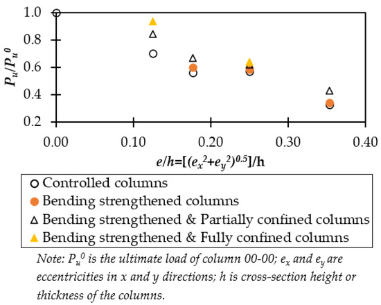 The increase of e/h ratio reduced the axial load-carrying capacity of the unstrengthened columns, e.g., the strength reductions of columns 00-25, 00-50, 00-2525, and 00-5050 were 29%, 43%, 44%, and 67% in comparison to column 00-00, as shown in Table 3. Figure 11 clearly shows the reduction of the load-carrying capacity of the columns when e/h ratio increased from 0.12 to 0.35, and the strength reduction was more pronounced for columns with e/h ratio of 0.35 as compared to columns with e/h ratio of 0.12. For instance, the load-carrying capacity of columns 00-5050 reduced by 67% and columns 00-25 exhibited a reduction of 29% regarding the controlled column 00-00, as shown in Table 3.