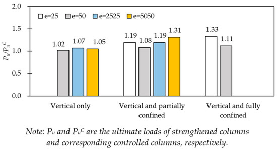 The experimental results have also shown that strengthening structures with CFRP sheets is a very effective method in providing lateral confinement to the concrete core. Figure 12 shows that the load-carrying capacity of the strengthened columns was significantly higher than that of the corresponding unstrengthened ones. The load-carrying capacity of the unconfined columns with only flexural strengthening increased by only 2–7%, while the corresponding strength improvement of the partially CFRP-confined columns ranged between 8% and 31%, and that of fully CFRP-confined columns increased 11–33% in comparison with controlled columns, as shown in Table 3. Figure 12 also shows that the difference of strengthening efficacy between partially confined columns and fully confined columns under eccentric load. For instance, the ratios Pu/PuC for partially confined columns 1iC25/00-25 and 1iC50/00-50 were 1.19, and 1.08, respectively, and the ratio Pu/PuC of fully CFRP-confined columns 11C25 and 11C50 were 1.33 and 1.11. Thus, it is worthy to carry out studies to further understand how the partial-CFRP-wrap contributes to the load-carrying capacity of these columns.