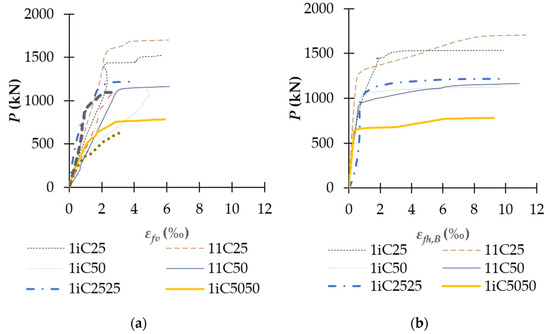 Figure 13, Figure 14, Figure 15 and Figure 16 show the relationship between the applied load and strain of CFRP sheets and reinforcements. The strains of rebars in all specimens are tabulated in Table 4. As shown in Figure 13 and Table 4, the ultimate strain of vertical CFRP sheets (εfvu) increased with the level of confinement. For example, the ultimate strain of partially CFRP-confined columns 1iC50, 1iC2525, and 1iC5050 increased 81%, 30%, and 81% regarding the corresponding unconfined columns 10C50, 10C2525, and 10C5050, respectively. The increase of vertical-CFRP-sheet ultimate strain of fully CFRP-confined columns were higher, up to 138% for column 11C50 regarding column 10C50. The ultimate strains of transverse CFRP sheets of fully CFRP-confined columns were higher than that of partially CFRP-confined columns. At the extremely compressive side (side B), the increases of εfhu,B were about 5% to 18%, and at the extreme tension side (side A), these increases of εfhu,A were much higher, up to 21–89%. This phenomenon is due to the better strain distribution of fully CFRP-wrapped columns than partially CFRP-wrapped ones. When e/h ratio increases, εfhu,A at extremely tension side becomes smaller and approaches zero for both the full and partial wrap. The CFRP strains at ultimate stage were about 0.92% and 0.99% for partially CFRP-wrapped columns and about 1.09–1.13% for fully CFRP-wrapped ones. These ultimate CFRP strains of partially and fully CFRP-wrapped columns correspond to 44–48% and 52–54% of CFRP nominal rupture strain determined from the flat coupon tests, respectively. The range of full wrap columns was inside the range between 51% and 78% of the nominal rupture strain reported by Lam and Teng [23] for fully CFRP-confined square columns, and that of partial wrap columns was slightly lower than the range between 51% and 78%. This observation indicated that partial CFRP-wrap was acceptable in term of developing CFRP tension capacity.
