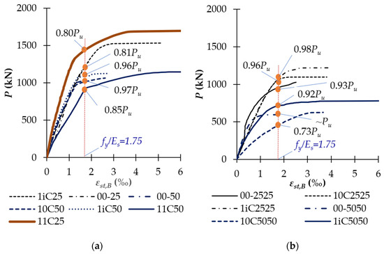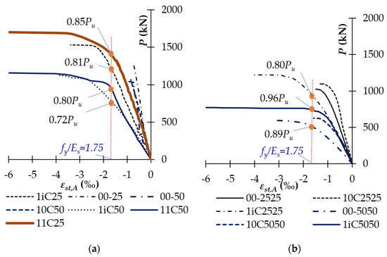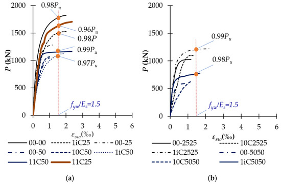 In addition, Figure 14 also shows that stirrups of the unstrengthened columns and unconfined columns did not yield at the ultimate stage. Particularly, stirrups of columns 00-00 under concentric loads yielded at 0.98Pu. This was because the deformation of the unstrengthened and unconfined columns was significantly lower than that of the strengthened columns. Therefore, these columns might fail before yielding stirrups. Meanwhile, stirrups of the partially and fully CFRP-confined columns yielded at the loading level of 0.96–0.99Pu thanks to the confinement effect. These observations have proven the interaction between CFRP and stirrups. The ultimate strain of stirrups of the partially and fully CFRP-confined columns was 1.6–2.0 and 1.8–2.4 times of that of the unstrengthened ones, respectively. These observations demonstrated that the use of partial-CFRP-wrap significantly affected the lateral displacement of the columns.