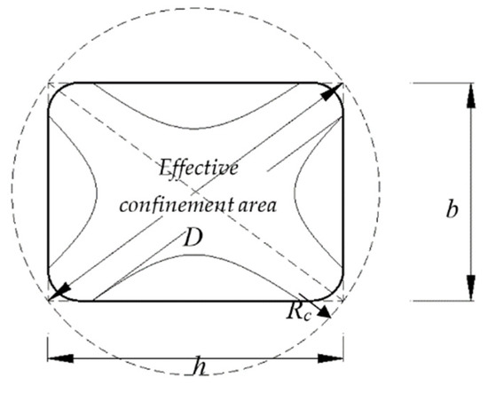 where Ag (mm2) is the cross-section of the columns considering the rounded corner with a radius Rc (mm) = bh − (4 − π)Rc2, Ast is the cross-sectional area of longitudinal reinforcements, f’cc is the compressive strength of confined concrete, and fy is the yield strength of longitudinal reinforcements.