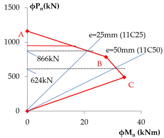 For predicting the effect of FRP confinement on strength enhancement, Equation (1) is applicable when the eccentricity present in the member is less than or equal to 0.1 h. For predicting the effect of FRP confinement on strength enhancement of columns under combined axial compression and bending, P-M diagrams were developed by satisfying strain compatibility and force equilibrium using the model for the stress–strain behavior for FRP-confined concrete presented in Equations (5)–(8). A simplified P-M diagram through three points was used. Equation (1) was applied to locate point A and the methodology provided in Appendix D in ACI 440.2R-17 [17] was used for the computation of a simplified interaction diagram. The ultimate compressive strength of columns11C25 and 11C50 is interpolated as shown in Figure 18.