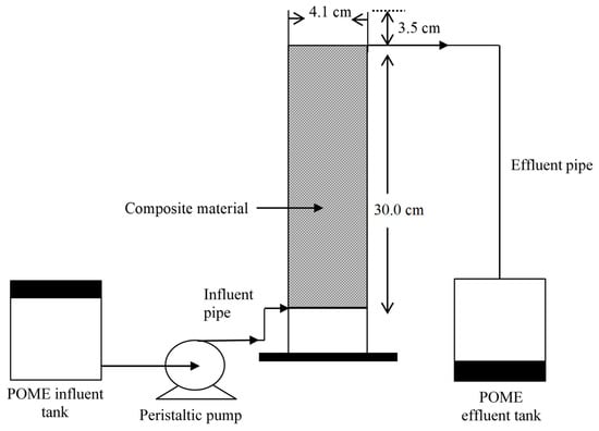 Continuous flow adsorption studies were conducted in a glass column with a 0.041 m internal diameter and a 0.30 m height of the column excluding the freeboard. A series of experiments were conducted with an influent concentration of POME in the packed composite column. In the column setup, a stainless steel was inserted to the bottom of the column and above the sieve was a layer of glass wool to prevent the loss of the adsorbent. A master flex peristaltic pump (Model Master flex Cole-Parmer Instrument Co.,Vernon Hills, IL, USA) was used for the upward movement of the effluent through the column at the designed flow rate and empty bed contact time (EBCT). The effluent was placed in a tank and pumped in the upward direction into the column. The solution was mixed with the composite until it attained the saturation point. Effects of process parameters such as flow rates (1.4, 2.0, and 2.6 mL/min) and other parameters were kept constant according to Table 1. Samples were then collected at various time intervals from the upper of the column and were investigated to determine the COD in the effluent concentration of POME.