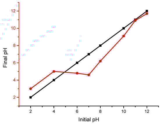The point of zero charge (pHpzc) determines the point at which the interfacial region of a material is electrically neutral. The experiment to determine the pHpzc of the composite was carried out using the 11 point pH measurement as adopted by Chechinel et al. []. A sample of 0.025 g of adsorbent weight of the composite was placed in a 100 mL conical flask, and 25 mL of deionized water was added to each of the flasks at different initial pH conditions. The pH was adjusted using 0.1 M NaOH and HNO3. The samples were agitated at 120 rpm for 24 h at 25 °C. At the end of the contact time, the final pH of each of the samples was measured. A plot of the final pH against the initial pH was produced from the obtained values. The point at which the plot of the final pH intersects with the plot of the initial pH value was recorded as the pHpzc.