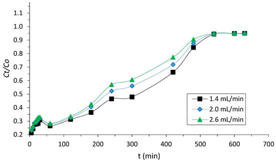 The effect of the influent flow rate on the reduction of COD from the adsorbate onto the composite adsorbent was investigated at different flow rates (1.4, 2, and 2.6 mL/min). The experiments were conducted at a fixed condition of bed height (30 cm) and pH (10). The pH of the adsorbate was adjusted using diluted H2SO4 and NaOH. The breakthrough curves is illustrated in Figure 3.