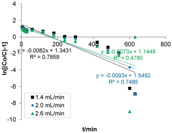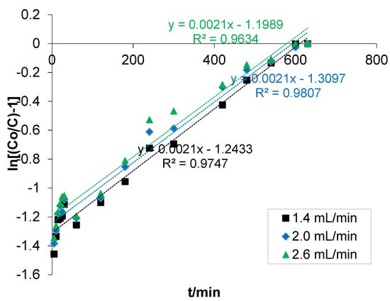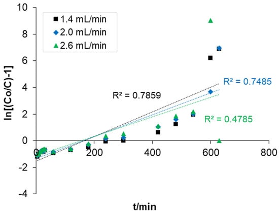 The Yoon–Nelson model is a fixed bed model used to predict the exhaustion time and the behaviour of the adsorption process for a given adsorbate concentration []. The model assumes that the rate of probability decline of adsorption for each adsorbate molecule is proportional to the adsorbate adsorption and breakthrough []. A linear plot of ln[(Co/C) − 1] against sampling time (t) and the values of ι and kYN were determined from the intercept and slope of the plot, respectively. The variation in the linear graph for adsorption of COD ions onto the bone-composite for different flow rates is shown in Figure 6. As can be seen, the flow rate increased from 1.4 to 2.6 mL/min at a constant bed depth of 30.0 cm, and the rate constant (KYN) increased with little significance while the time required for 50% breakthrough decreased. The value of the R2 obtained from the fitted experimental data to the model at different flow rates indicated that earlier breakthrough was reached at a higher flow rate and at less residence time of the solute to diffuse through the length of the sorption column []. The results obtained agreed with previous work carried out by [].
