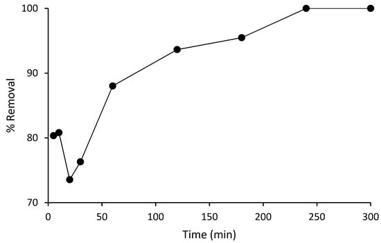 It can be seen that at a higher flow rate, a lower EBCT was achieved. It was shown that at a lower EBCT, there was a lower diffusion process of the solute–adsorbent interaction, and this trend resulted in a lower adsorption capacity [,]. From the results of the investigation, it was revealed that the composite packed column enhanced the reduction in COD more at a lower flow rate influent concentration. The longer breakthrough time of 5.15 h was obtained at the optimum flow rate. The retention time became shorter with an increase in the velocity of the influent concentration. It is apparent that at the influent flow rate of 2 mL/min, the breakthrough time was achieved at 4.45 h. It was observed that the breakthrough time was 4.26 h at 2.6 mL/min. Therefore, it revealed that the breakthrough time was the lowest at the highest flow rate influent concentration. This phenomenon was due to a shorter contact time between the interaction of the solute and the composite adsorbent in the packed column. This resulted in less diffusion of the solutes into the pores of the composite. This trend was observed in the previous studies [,].
