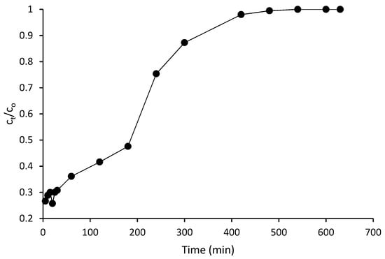 The data obtained from the fixed bed adsorption for the optimum flow rate influent concentration were fitted to the Thomas model (Figure 4). The model is one of the most widely used to describe the adsorption process behaviour in fixed-bed columns. The model, which is derived from the second–order kinetics, assumes that adsorption is dominated by mass transfer at the interface and the chemical reaction []. It is generally known that the slight reduction in correlation coefficient values (R2) indicated that the main limitation is that its derivation is based on a second-order kinetics and considers that adsorption is not limited by the chemical reaction, but is controlled by the mass transfer at the interface [].