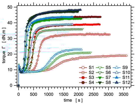 Rheological measurements during curing were performed with a Monsanto R100 Oscillating Disc Rheometer at 160 C. The torque values measured during curing for all samples in the series are shown in Figure 1. The torque difference is recorded, where dN·m is the torque measured in the rheometer prior to crosslinking and is the maximum torque at the optimum of crosslinking. While is related to the viscosity of the uncrosslinked polymer, should give the shear modulus of the crosslinked material, which is proportional to the crosslink density: .